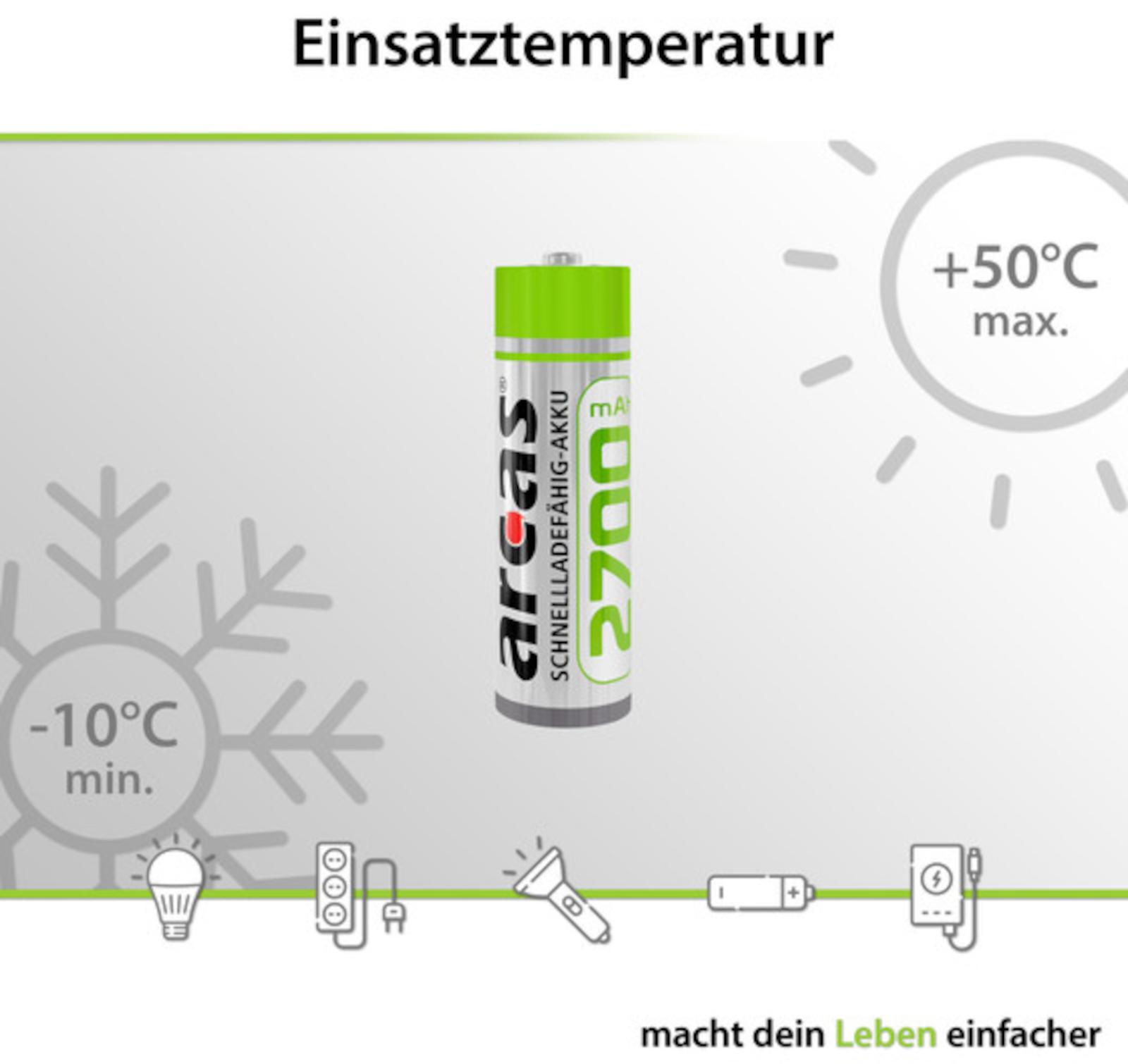 Die wiederaufladbaren Akkus haben eine lange Lebensdauer und eine geringe Selbstentladung. Die Schnellladung bei 160 mA beträgt nur rund 6 Stunden. Der Nickel-Metall-Hybrid Akku hat eine Kapazität von 800 mAh, 1,2 V und eine hohe Energiedichte. Besonders geeignet sind sie für Gartenbeleuchtung oder schnurlose Telefone. Durch die schnelle Ladefähigkeit und lange Haltbarkeit müssen die Akkus nur selten gewechselt werden. Mit einer Länge von 50,1 mm und einem Durchmesser von 14,1 mm sind die Akkus kompatibel mit die meisten herkömmlichen Geräte, egal ob im Haushalt oder am Arbeitsplatz.