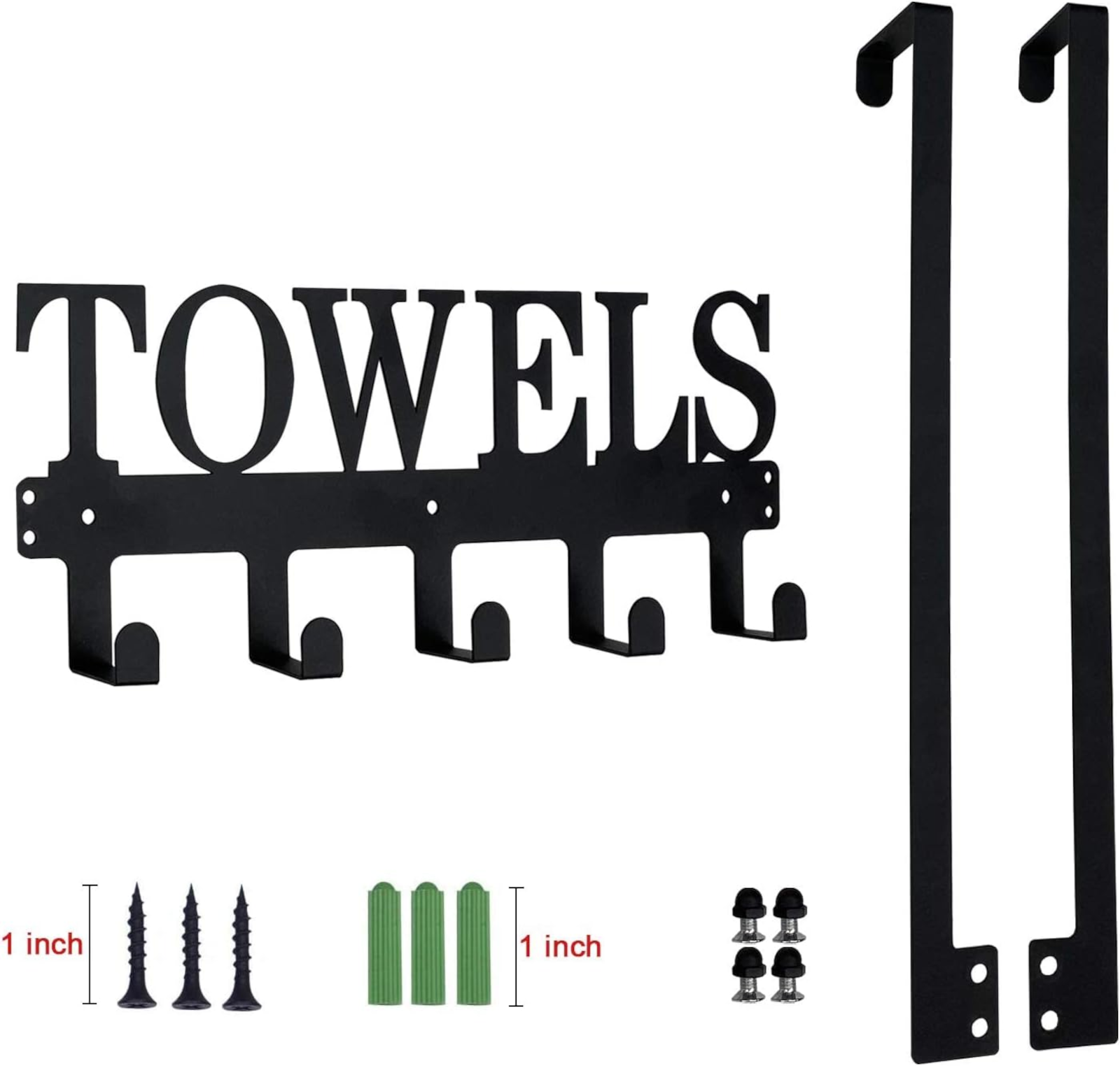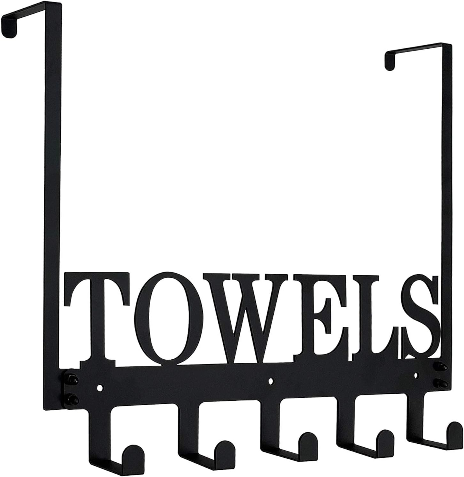 EWANTO hochwertiger Handtuchhalter aus Metall. Gratfreier Laserschnitt mit der Aufschrift "Towels" für Ihr Badezimmer, mattschwarze Oberfläche. Design Türhakenaufhänger mit 5 Haken, rostfrei, wasserfest und, pflegeleicht, einfach mit einem feuchten Tuch abwischen. Im Lieferumfang inbegriffen sind: 1 x Handtuchhalter und zur Montage (optional) 3 x Schrauben, 3 x Dübel sowie 3x Klebeverbindungen.