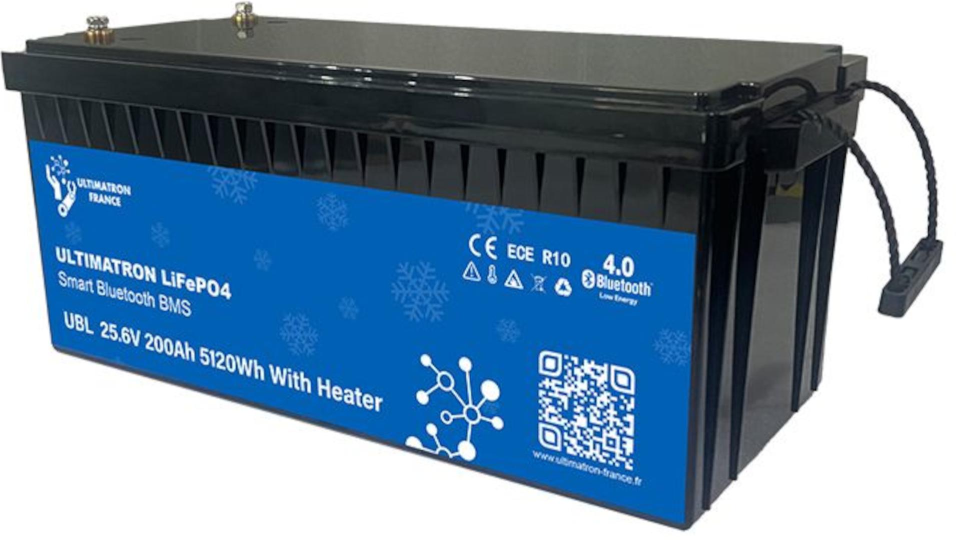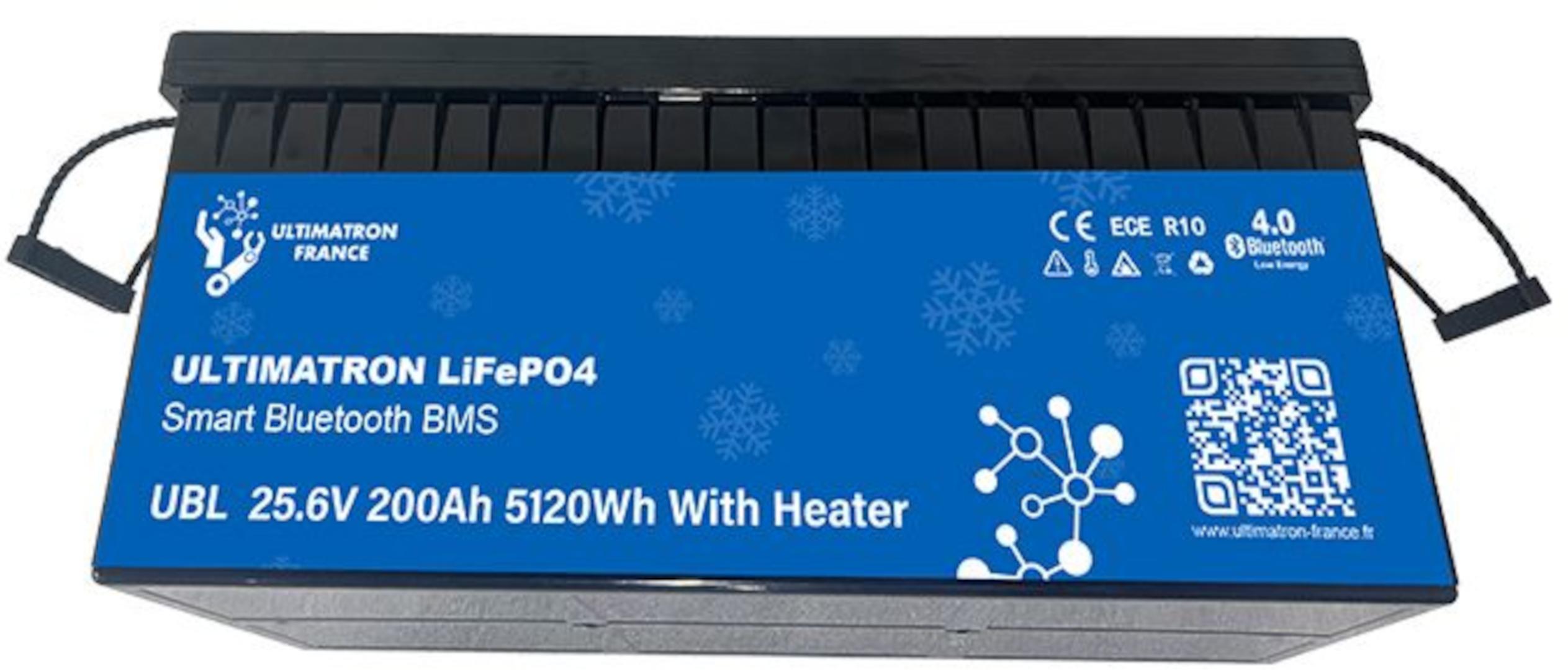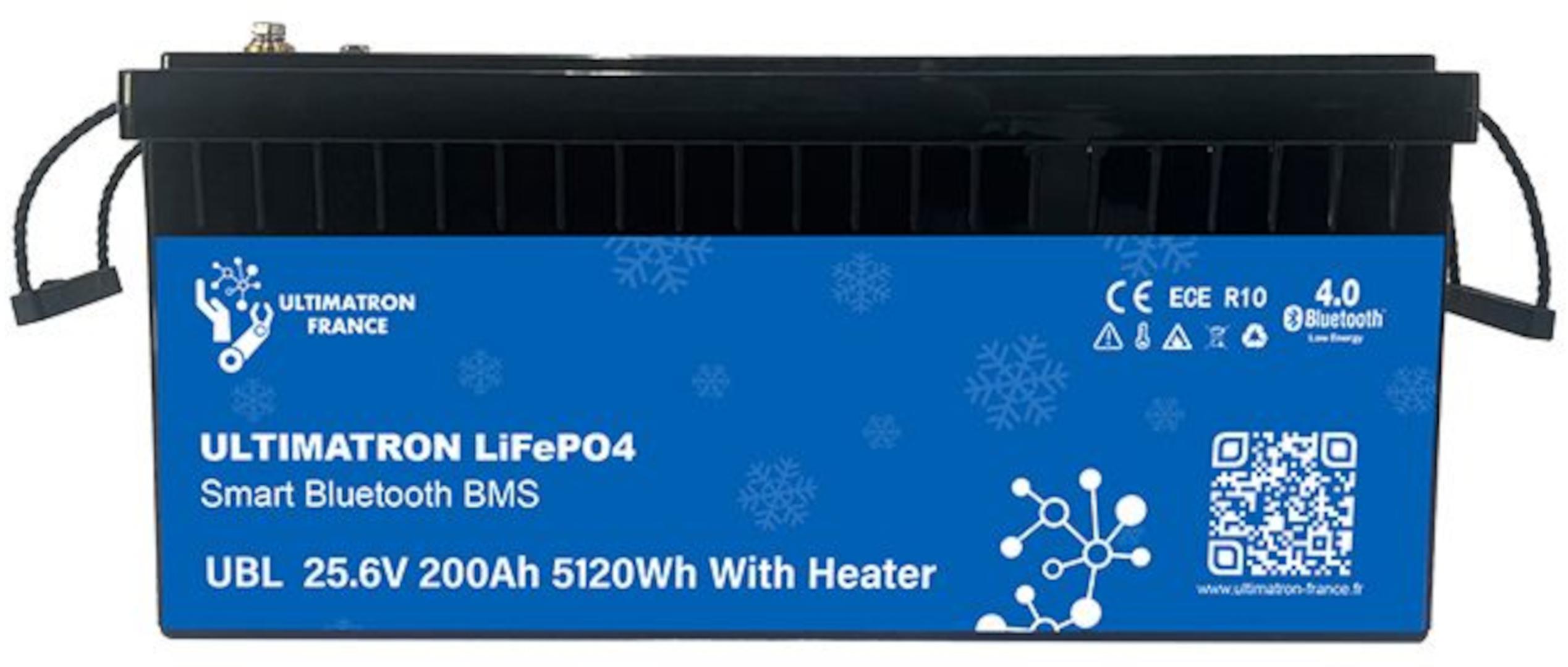 Die Ultimatron LiFePO₄-Batterie mit einer Nennspannung von 25,6 V und einer Kapazität von 200 Ah (entspricht ca. 5,12 kWh Energieinhalt) verbindet moderne Lithium-Eisen-Phosphat-Technologie mit einem integrierten Smart BMS, Bluetooth-Überwachung sowie einer Heizfunktion für niedrige Umgebungstemperaturen. Das robuste Kunststoffgehäuse (Plastic Case) schützt vor Feuchtigkeit und mechanischen Einflüssen.